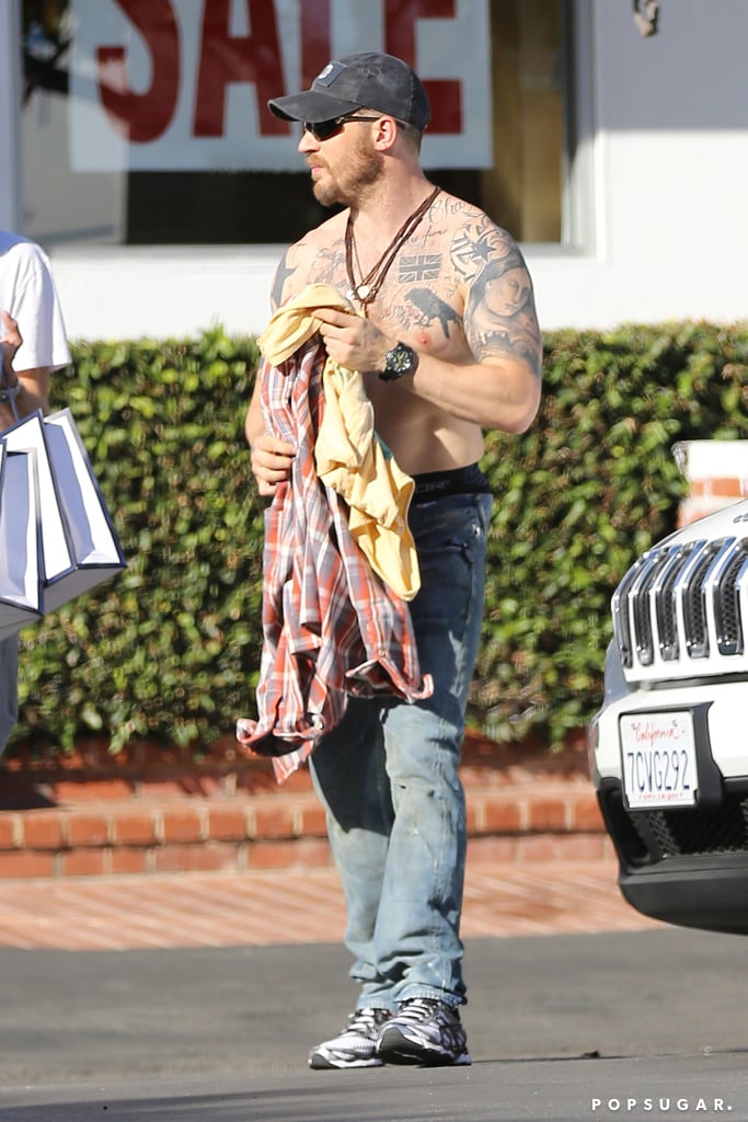 Imagine it: you're walking in a parking lot in LA when you suddenly see hot British actor and known puppy-lover Tom Hardy walking around shirtless. Well, that's exactly what happened when Tom and a friend hit up a Ron Herman store in LA on Sunday and the actor decided to strip off his top to change right in the middle of the street. The actor is back in LA after doing a whirlwind press tour for his latest release, The Drop, which hit theaters on Sept. 12. Now, Tom is gearing up for his latest project, The Revenant, which is set to begin filming very soon. The Revenant has been getting a lot of attention lately, as Leonardo DiCaprio will make his return to the big screen on the project after taking a short filming hiatus. According to The Hollywood Reporter, The Revenant may be the last Leo film for some time, as the actor plans to take "a lengthy break from acting" once he finishes up filming.