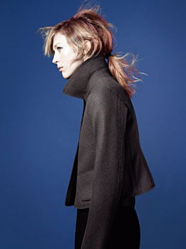 Sander, who has signed on to do the collection through 2013, introduced her Fall 2010 offering to Hilary Alexander. The palette runs black, navy, white, silver-grey, beige, and all shades of blue — "Storm to sky," Sander says. There's a silvery down jacket with little leggings ("almost couture," Sander notes); a midnight felt coat, with detachable gilet and hood ("the most expensive felt, and real buttons, NOT plastic, which we hate"); a black wool and cashmere jacket ("very Jil Sander"); duffle coats in pewter wool, tight-fitted, and high-waisted ("they could be £2,000 at designer level"). The collection ranges from $15.90 for cut-and-sewn to $229.90 for outerwear.