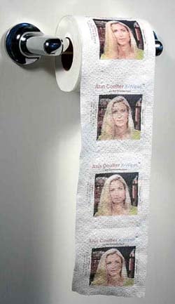 That's why it's with great pleasure that I introduce you to X-Wipes' new edition to their printed TP family: Ann Coulter toilet paper. Coulter's made a mess of political discourse with her verbal diarrhea, and we the people need to clean it up. The medium is the message! Available for purchase on April Fool's Day, so get your own roll soon and wipe back!